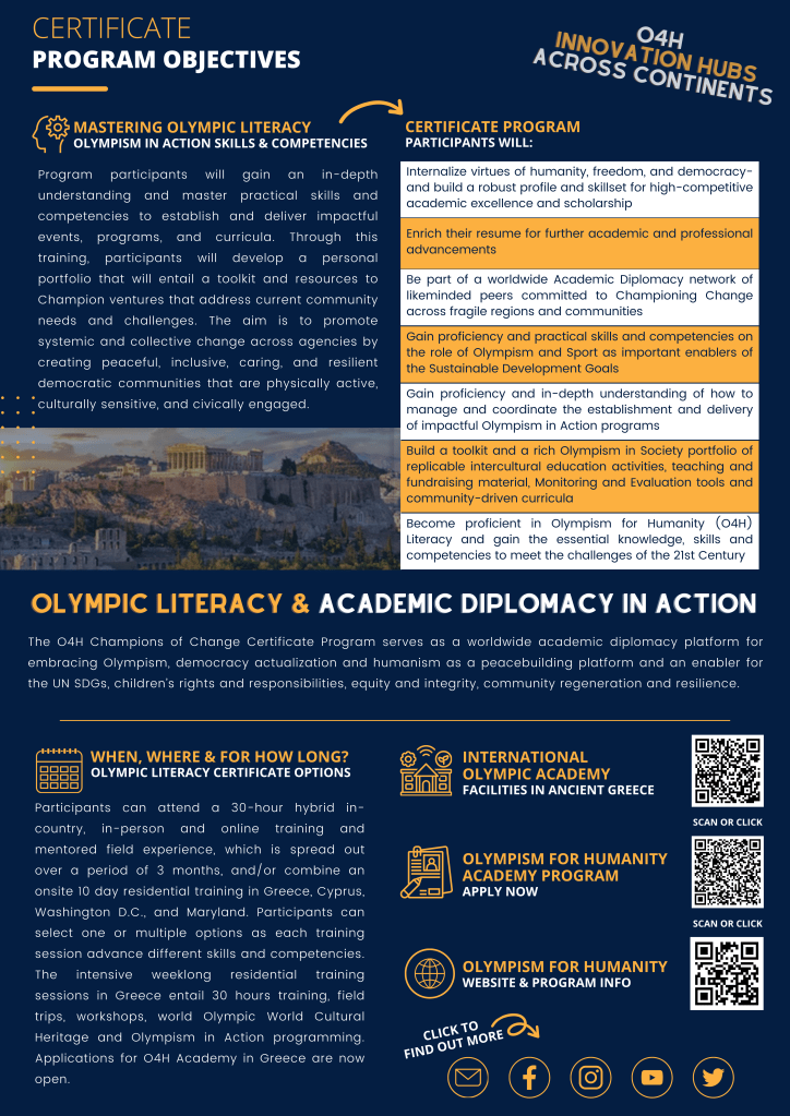 Olympism for Humanity Academy takes part at the birthplace of the Olympic idea, Political Philosophy, Peace Education, Democracy for Innovation and Ideals: in Delphi, Athens and Ancient Olympia. Our O4H Champions of Change Certificate program serves as a Global Academic Innovation Hub for preserving and embracing the Olympic idea as a peacebuilding platform and an enabler for the UN SDGs. Through our universal Applied Olympic Studies-Sport for Development O4H learning model, participants across continents develop a personal portfolio with guidelines on how to design and deliver data driven “social innovation ventures” to champion collective and systemic change across agencies, in their respective communities.