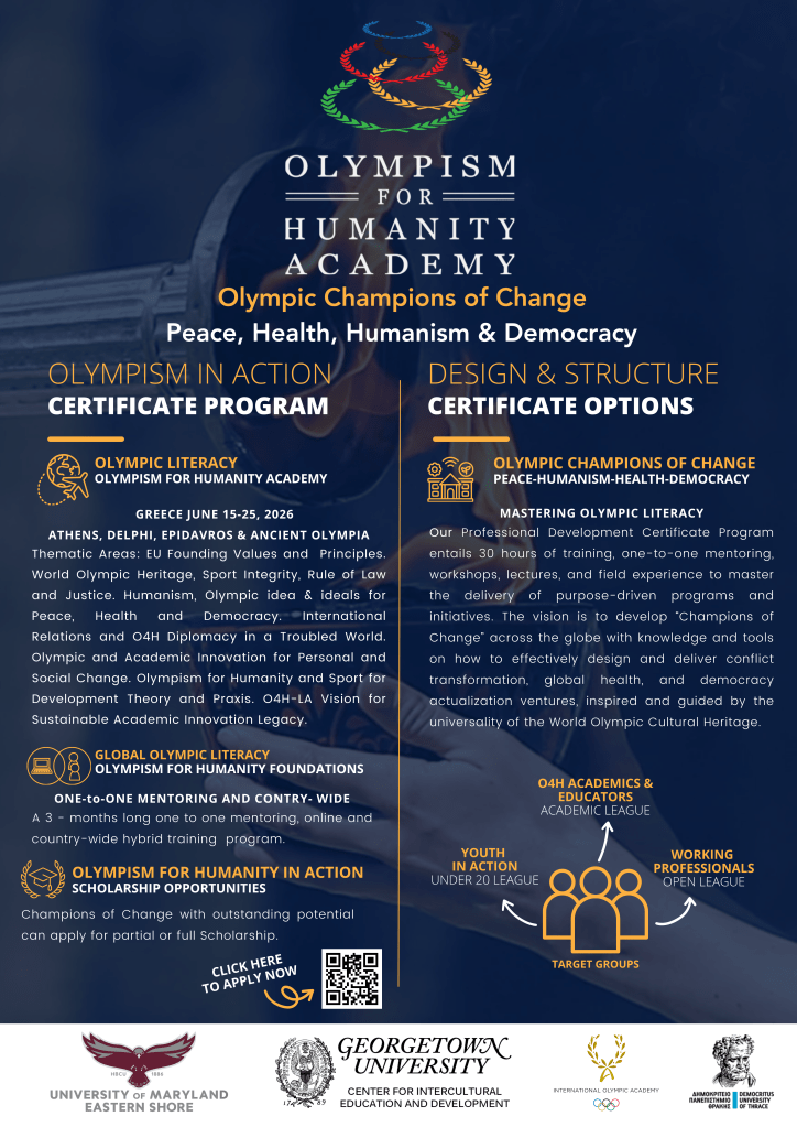 Olympism for Humanity Alliance (O4H), the Center for Intercultural Education and Development (CIED) at Georgetown University (GU), the University of Maryland Eastern Shore (UMES), the International Olympic Academy (IOA), the Democritus University of Thrace (DUTh) and Olympism for Humanity Allies across continents, have joined forces to establish an Olympism for Humanity Champions of Change Certificate Program to prepare free, democratic global citizens who are trained to Champion Change across fragile regions and communities.
